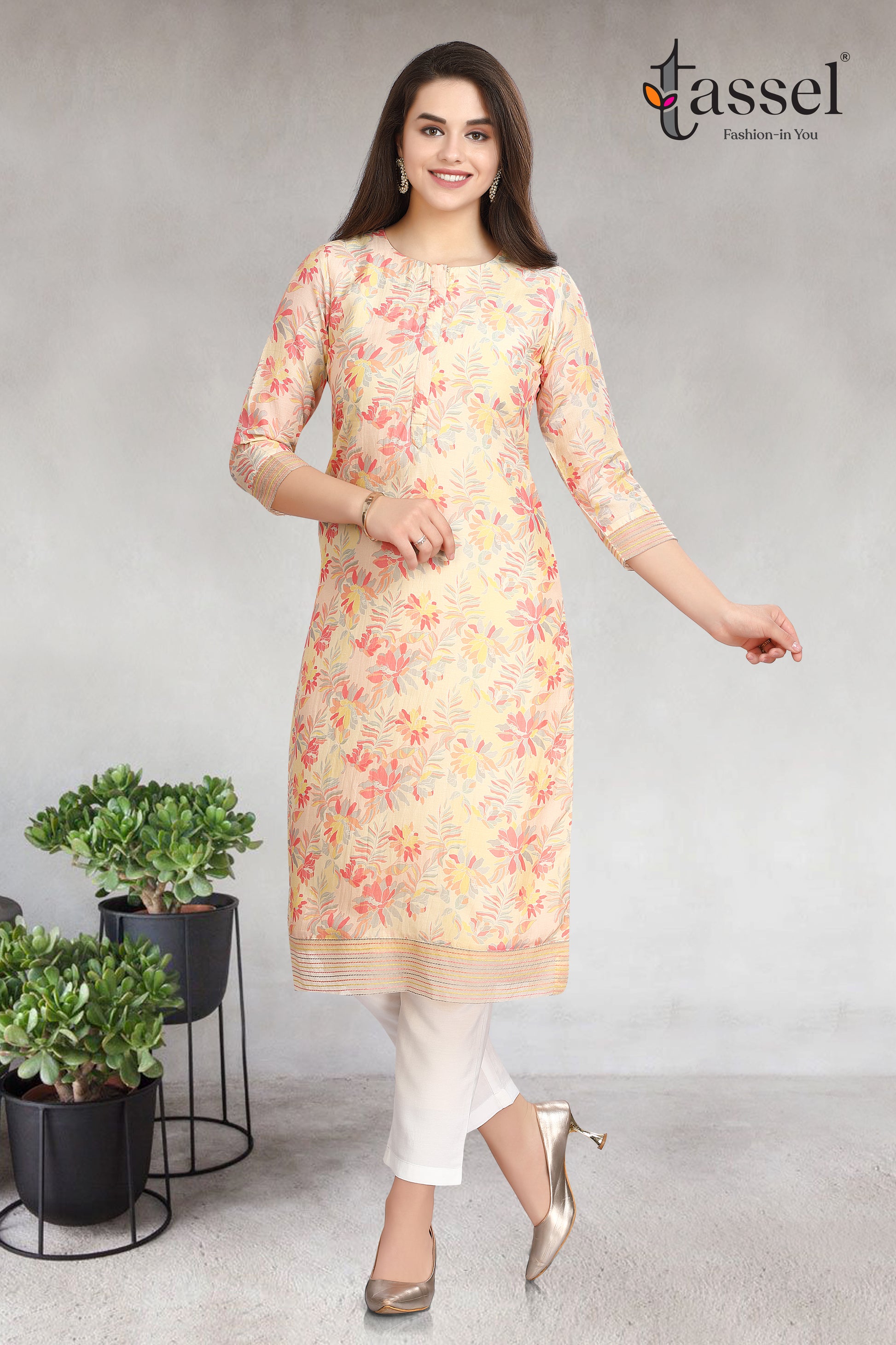 Cream Round neck Kurti with Organza detailing in sleeves and daman