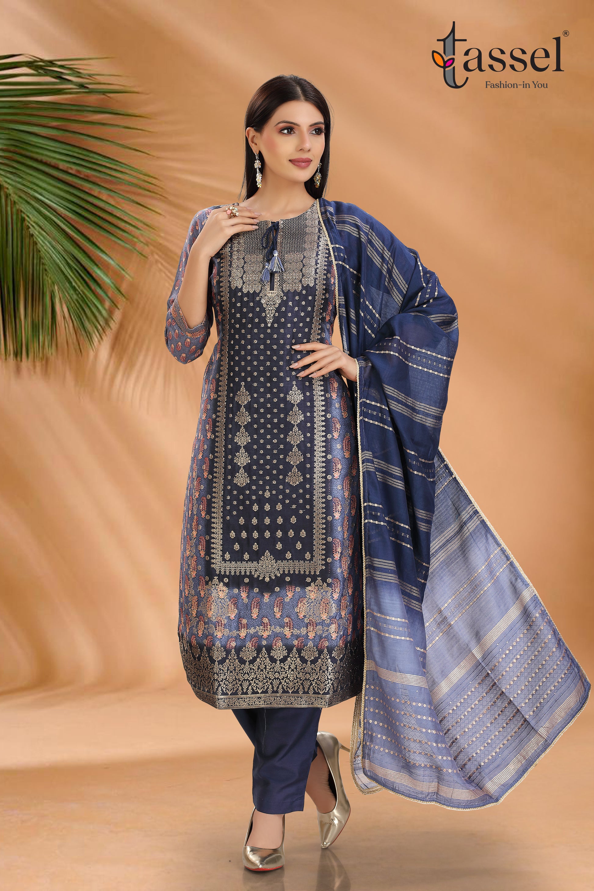 Blue Mughal butti Jacquard Suit Set with Pants and Zari Shaded Dupatta