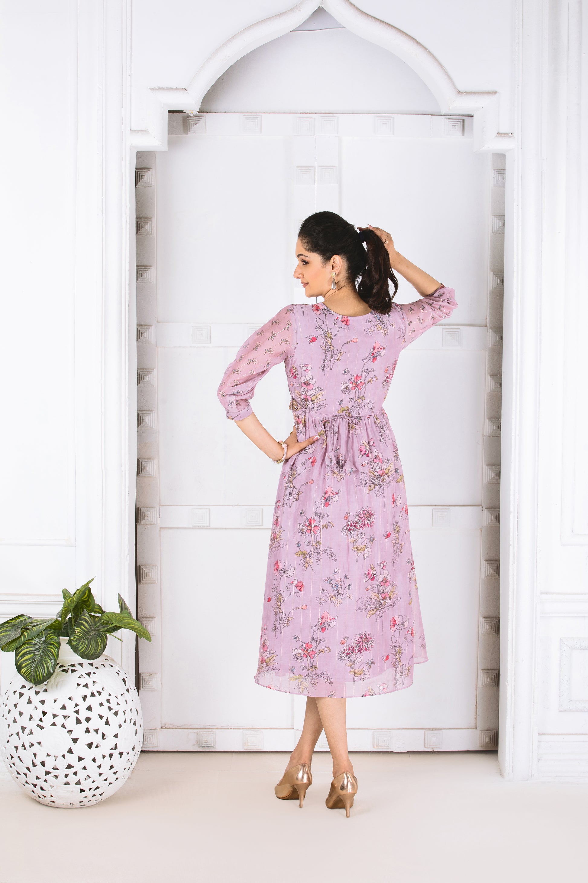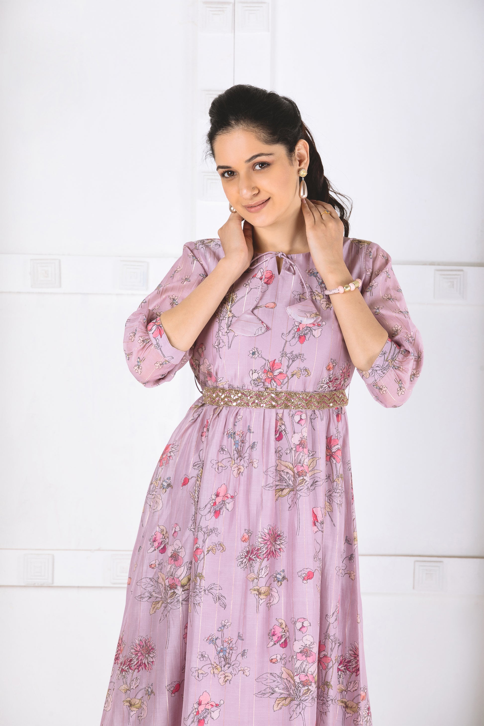 Floret Lavender midi dress with hand embroidered Zardozi waist belt.