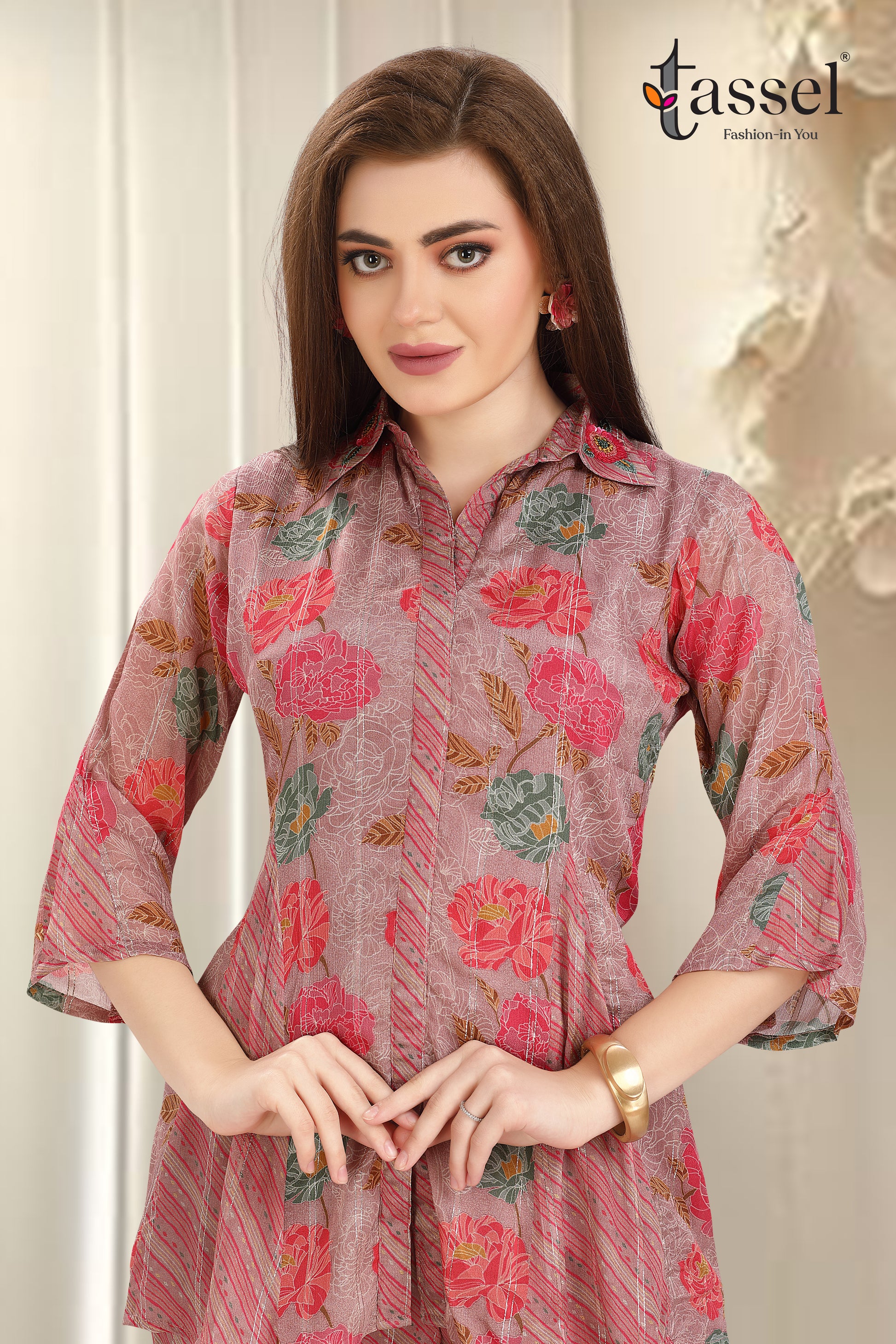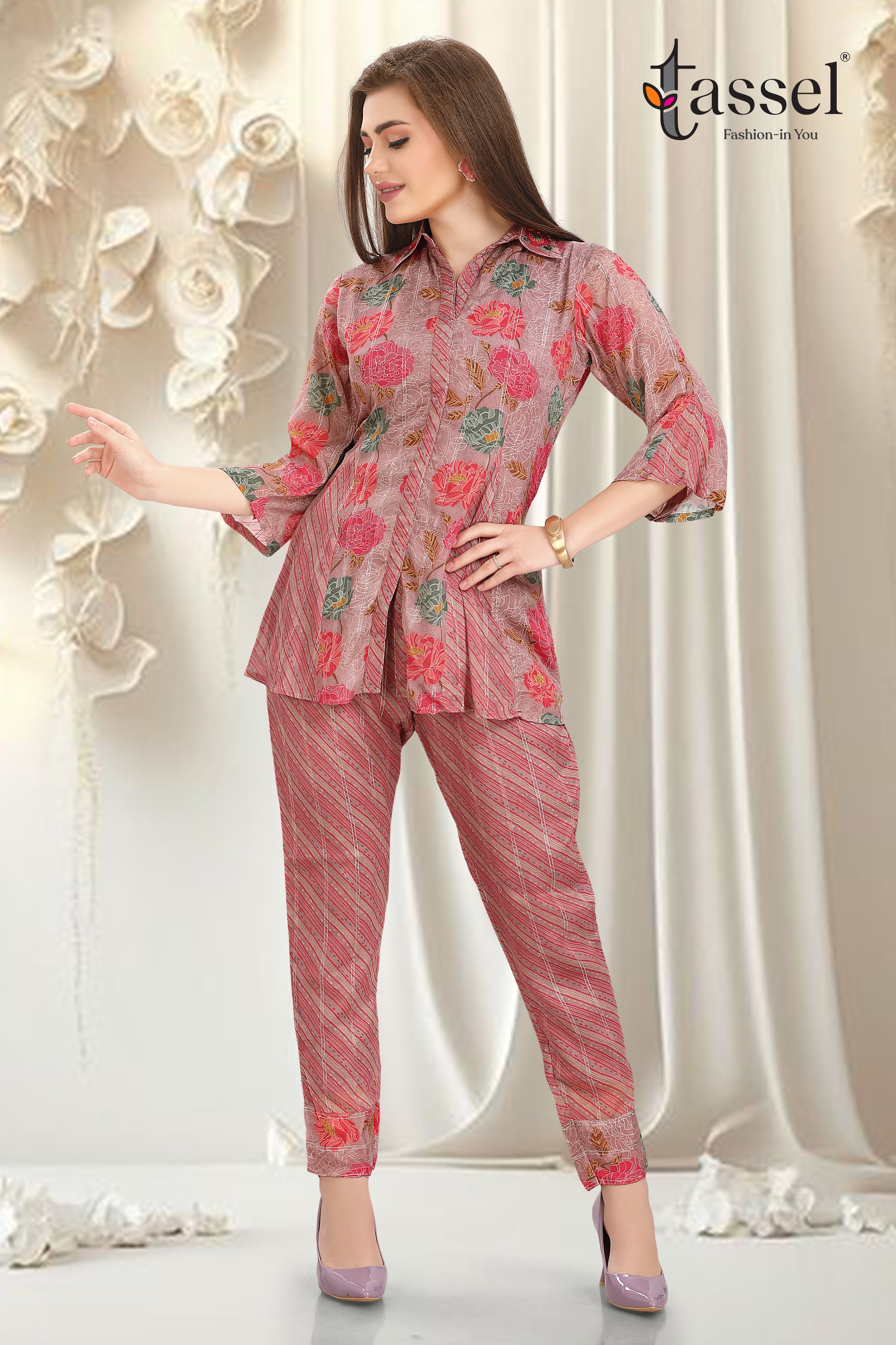 Lavender Festive coord set in Chinnon fabric with intricate hand embroidery on the collar and coordinated pants.
