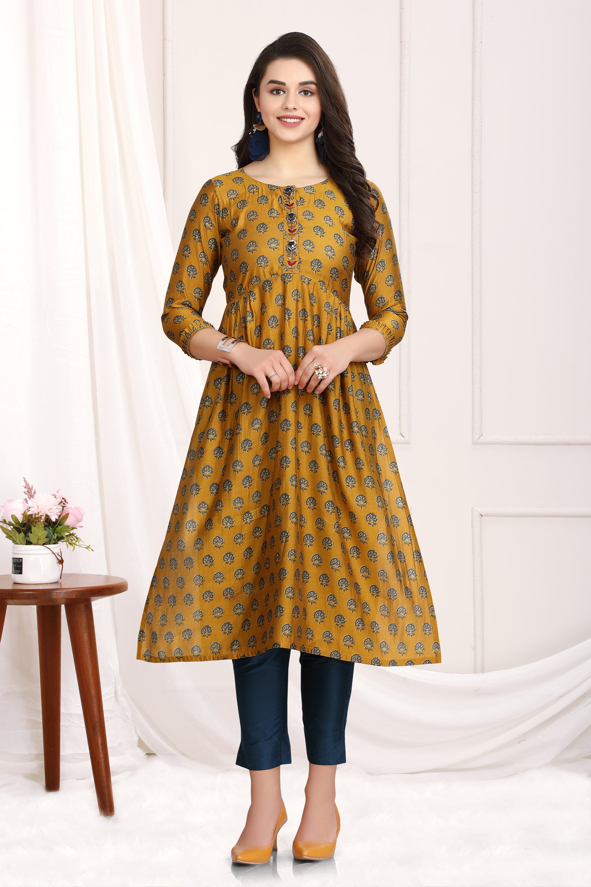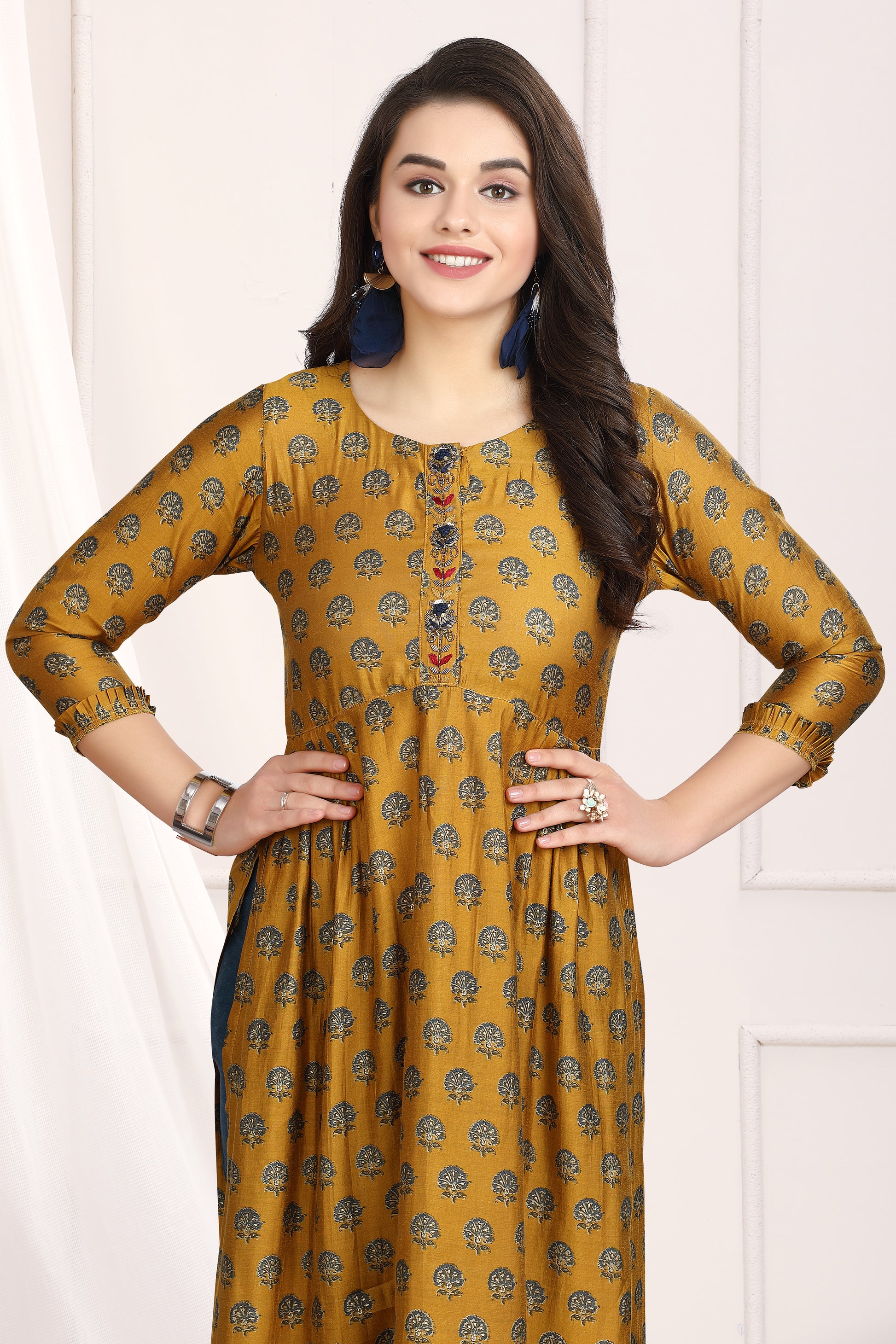 Mughal butti mustard cotton kurta pant set with hand embroidered kurta-patti.