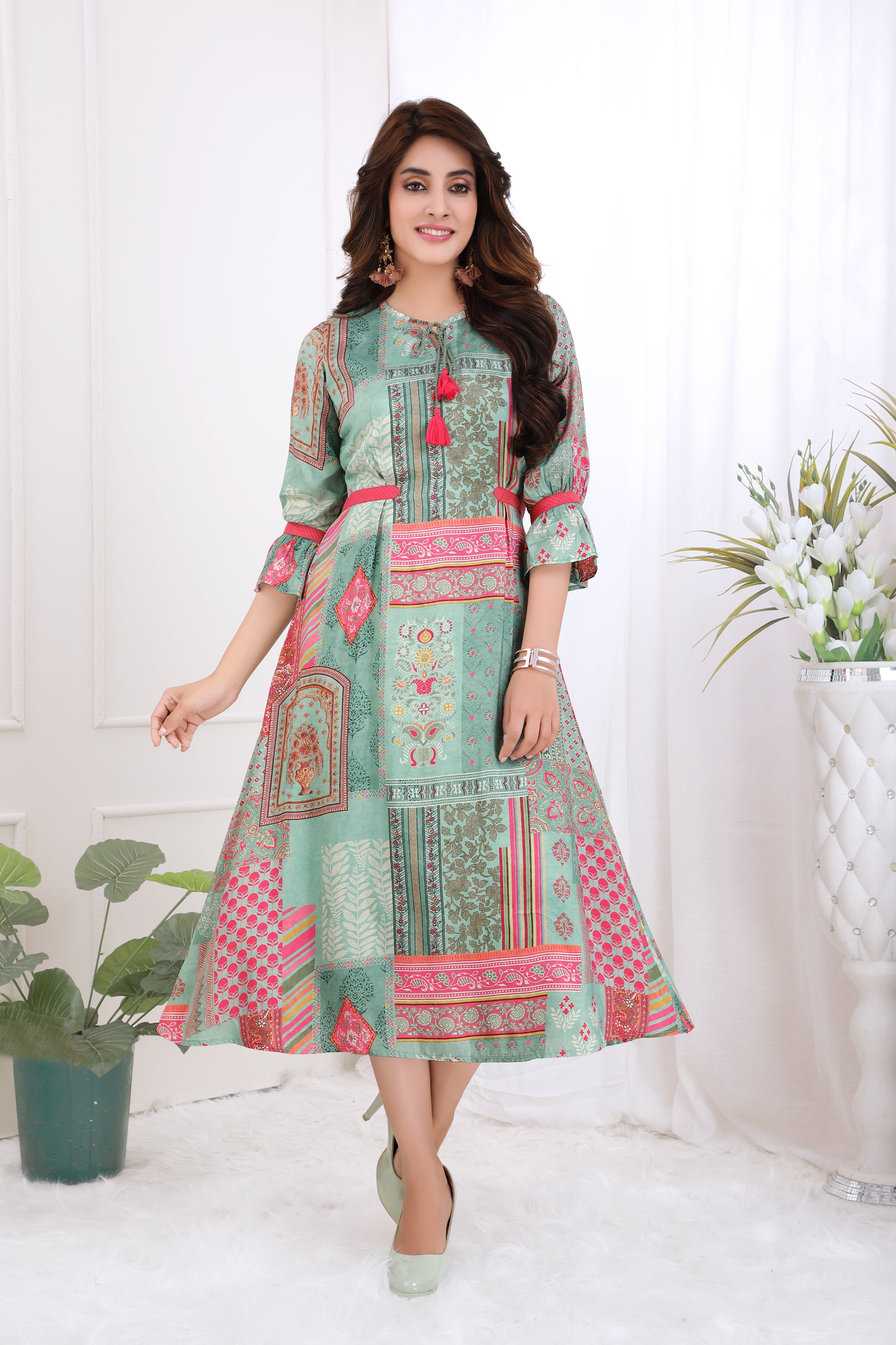 Contemporary Green midi dress with Tassel tie-up neckline.