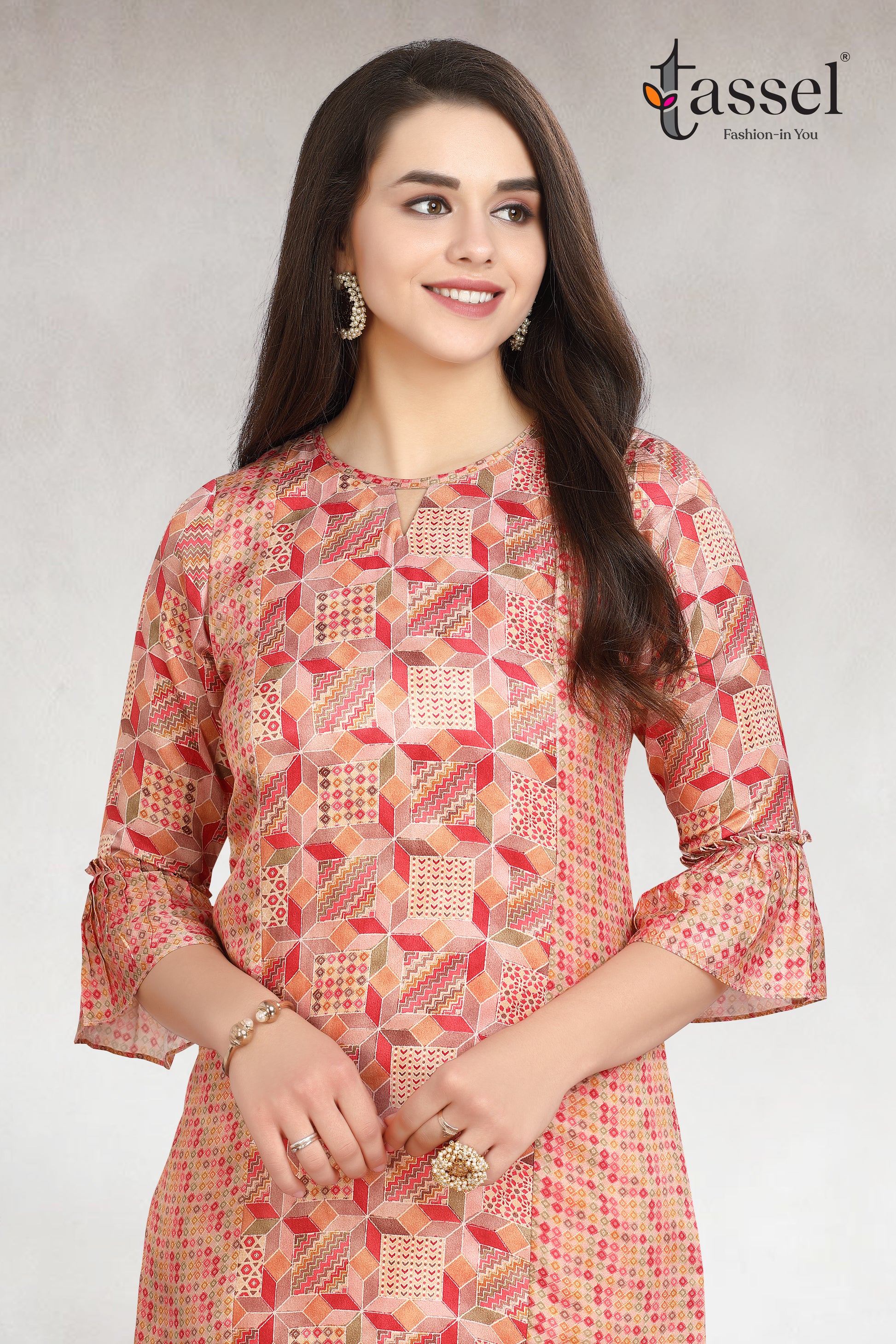 Multicolour satin Kurti in panel pattern with ruffle sleeves.