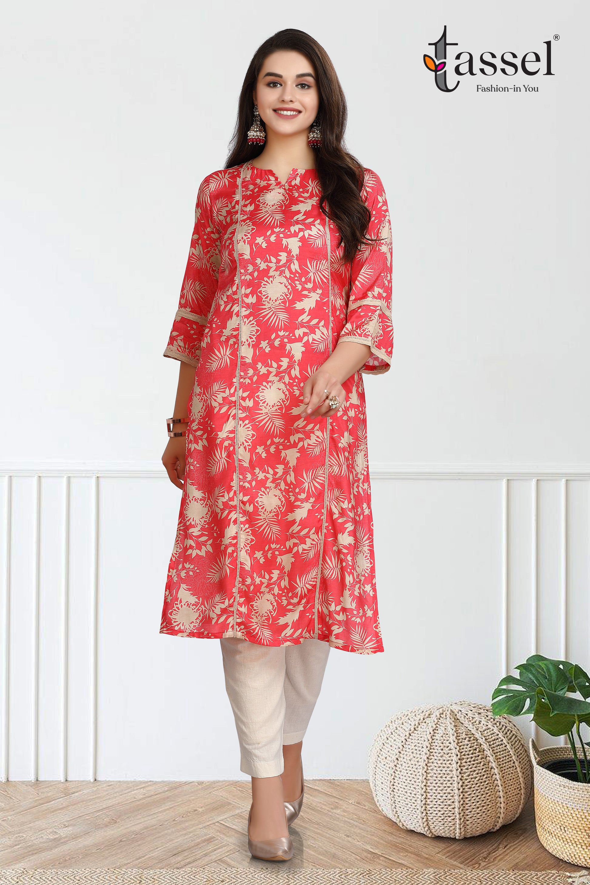 Pure muslin Kurti with panel pattern and lace detailing in the front.