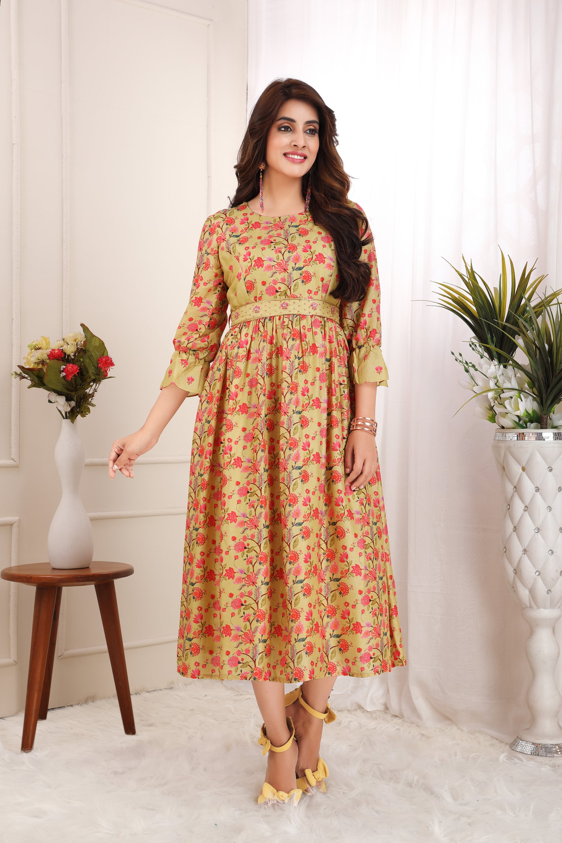 Yellow Midi dress with hand embroidered waist belt adding a chic look to the outfit.